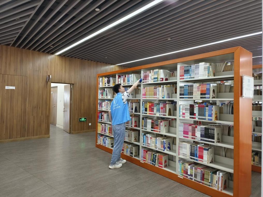 在清扫的过程中,同学们被分成小组,每个小组负责一楼层的清扫区域。大家用心地清理着地上的纸屑和书架上的灰尘,尽可能让图书馆恢复它的整洁与舒适。