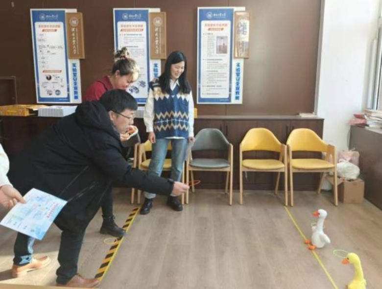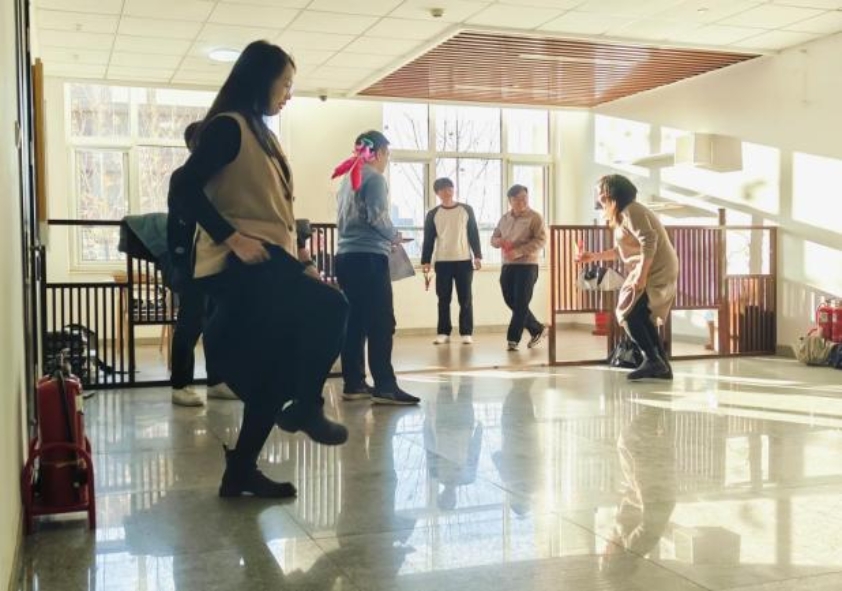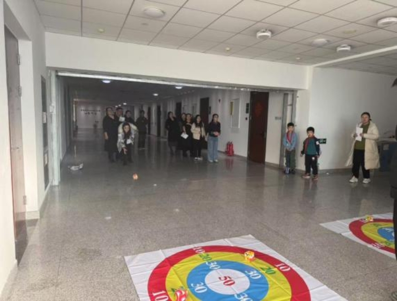 游戏大观园环节精彩纷呈。其中包括“圈定乾坤” -套圈游戏、"毽舞飞扬 "-1分钟踢毽子、“沙包逐鹿 ” -趣味沙包和"壶中妙趣" - 投壶游戏。参与活动的老师们先在机材楼514室门口领取卡片并填写自己的号码,接着依据卡片上的地点提示去参与各个游戏。当完成全部四项游戏后,老师们回到机材楼514室投入卡片,同时获得抽奖资格。整个游戏过程中,老师们欢声笑语不断,现场气氛十分欢快。