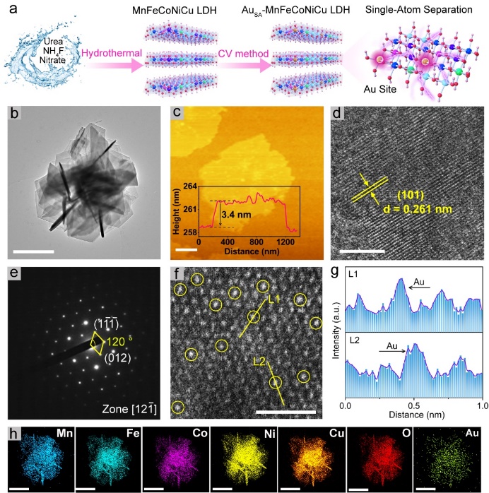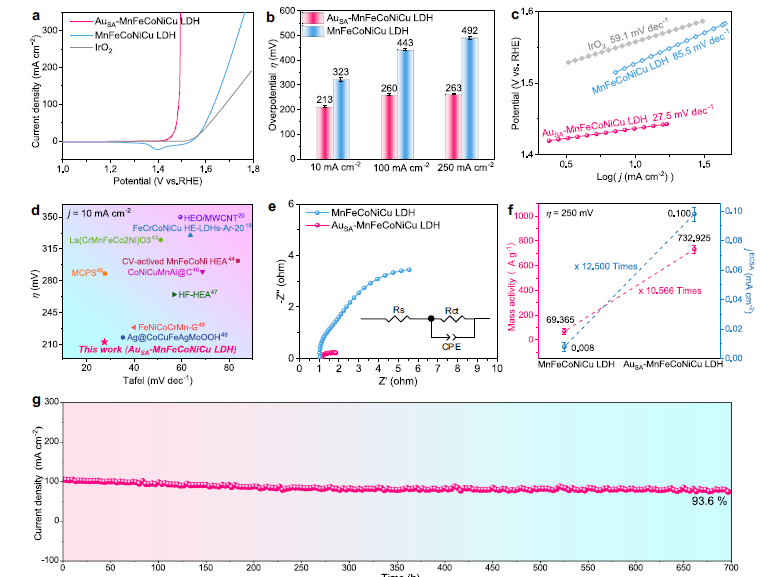 最新研究表明基于晶格氧氧化机制(LOM)的OER反应路径可以突破传统吸附质析出机制(AEM)的理论极限,显著提升反应动力学,成为当前的研究热点。然而,OER催化剂中大量晶格氧的氧化会引起金属离子的浸出和结构的坍塌,导致活性急剧下降。针对这个问题,该研究提出了“熵稳定效应”解决LOM基电催化剂稳定性差的新思路,开发出一种新型的高熵层状氢氧化物电催化剂,通过引入金单原子和氧空位,成功活化高熵催化剂的晶格氧,触发LOM机制。所合成的高熵催化剂不但具有优异的催化活性(213 mV@ 10 mA cm-2,1.0 M KOH),还具有良好的稳定性,在~100 mA cm-2的大电流密度下还能保持700 h的长时间稳定性,优于商业IrO2和绝大多数的LOM基OER电催化剂。该研究结合先进的同步辐射X射线吸收、原位拉曼光谱、氧同位素标定及密度泛函理论计算等技术,揭示了金单原子与氧空位协同激活高熵电催化剂晶格氧及提升本征催化活性的机制,阐明了“高熵效应”增强LOM基催化剂稳定性的机理。此项研究为开发新型、高活性和高稳定性的基于LOM机制的高熵析氧电催化剂提供理论依据和技术支持。