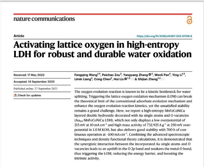 近日,我院刘辉教授和郑士建教授在国际顶尖期刊《Nature Communications》上发表题为“Activating lattice oxygen in high-entropy LDH for robust and durable water oxidation”的研究论文。该研究工作是学院在Nature子刊系列的首次突破,也是学校双一流学科建设的阶段性研究成果。我院2021级硕博连读研究生王芳卿为第一作者,刘辉教授和郑士建教授为共同通讯作者,kaiyun体育官网登录入口材料科学与工程学院生态环境与信息特种功能材料教育部重点实验室为第一署名单位和唯一通讯单位。论文原文链接为https://www.nature.com/articles/s41467-023-41706-8。