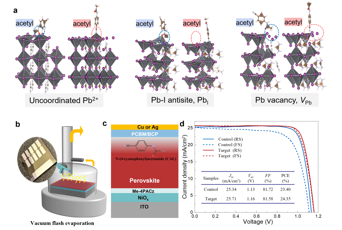 图2 (a)理论计算CAL分子中官能团与钙钛矿中多种缺陷的作用机制;(b)基于真空闪蒸技术在空气中制备的钙钛矿电池器件;(c)器件的整体结构示意图;(d)器件的光伏特性J-V曲线数据。