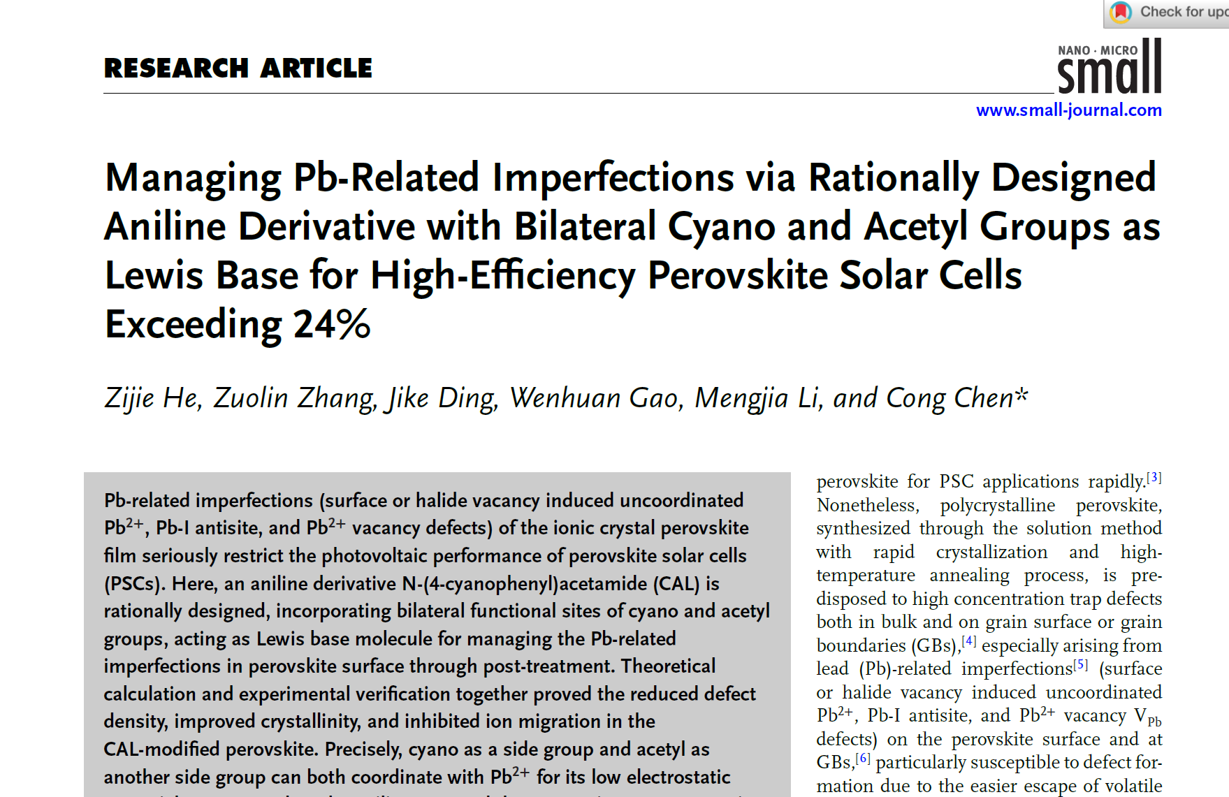 2024年6月12日,WILEY出版社旗下的国际纳米材料领域知名期刊《Small》在线刊登了我院层状材料与器件团队陈聪教授等人在钙钛矿光伏电池方面取得的研究成果——Managing Pb-Related Imperfections via Rationally Designed Aniline Derivative with Bilateral Cyano and Acetyl Groups as Lewis Base for High-Efficiency Perovskite Solar Cells Exceeding 24%(通过合理设计苯胺衍生物钝化剂来管理铅缺陷实现超过24%的钙钛矿太阳能电池)。本研究成果的第一作者为我院2021级本科生何子杰同学。我校为该论文的唯一完成单位。