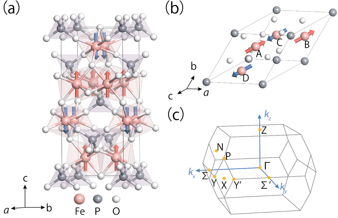2 (a) β-Fe2(PO4)O 的单胞 (b) 原胞。红色和蓝色箭头分别表示上自旋和下自旋的磁矩。(c) 表示布里渊区。