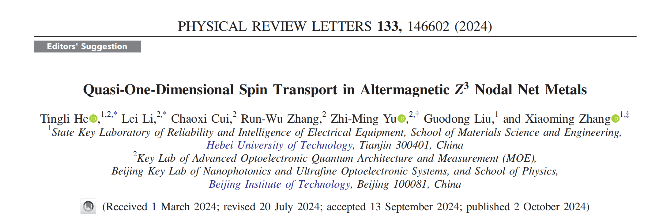 近日,材料科学与工程学院新型电子功能材料团队与北京理工大学合作在物理类顶刊《Physical Review Letters》上发表了题为“Quasi-One-Dimensional Spin Transport in Altermagnetic Z3 Nodal Net Metals”的研究型论文(入选Editors Suggestion)。kaiyun体育官网登录入口为第一完成单位,材料科学与工程学院博士生何婷丽与北京理工大学李磊博士为论文共同第一作者,张小明教授与北京理工大学余智明教授为论文共同通讯作者。