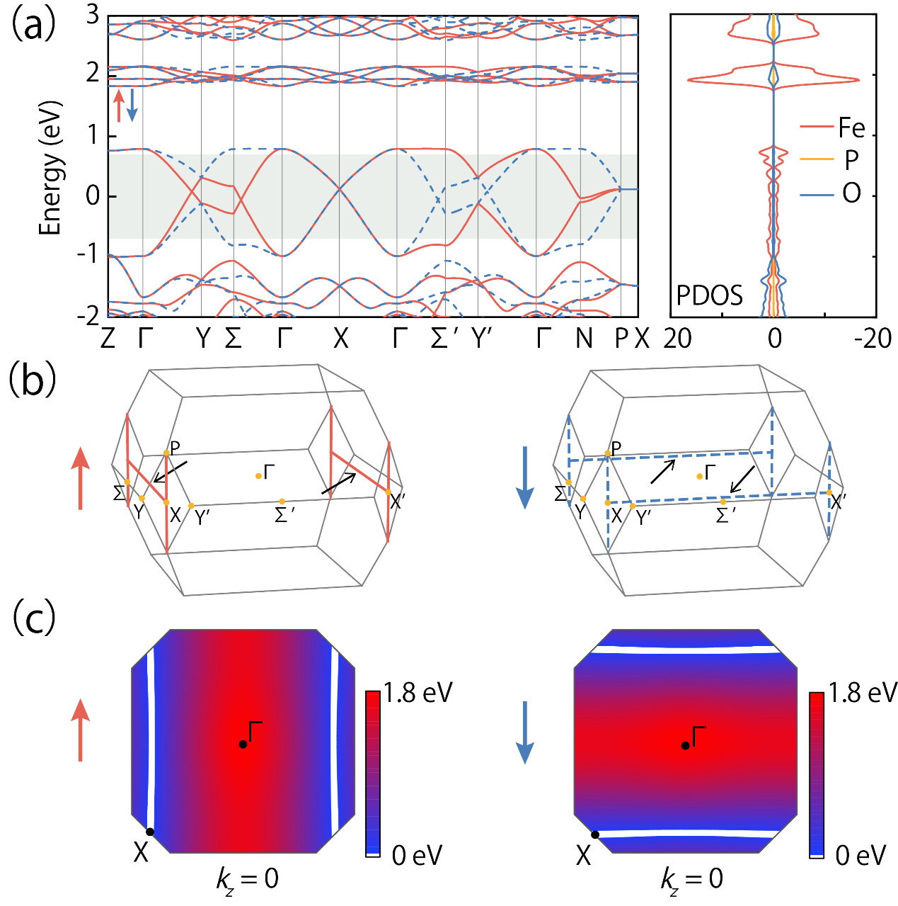 3 (a) β-Fe2(PO4)O 的能带结构和投影态密度。绿色高亮区域表示 Z3 交错磁性的节线网出现的能量区间。(b) 上自旋和下自旋通道中 Z3交叉节线的形状。这两条 Z3 交叉节线形成了一个 Z3节线网。(c) kz = 0 平面上,上下自旋通道的 Z3节线形状,如 (b) 中的箭头所示。