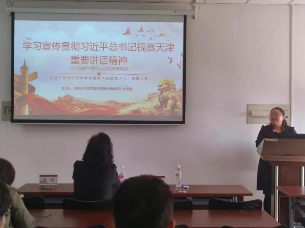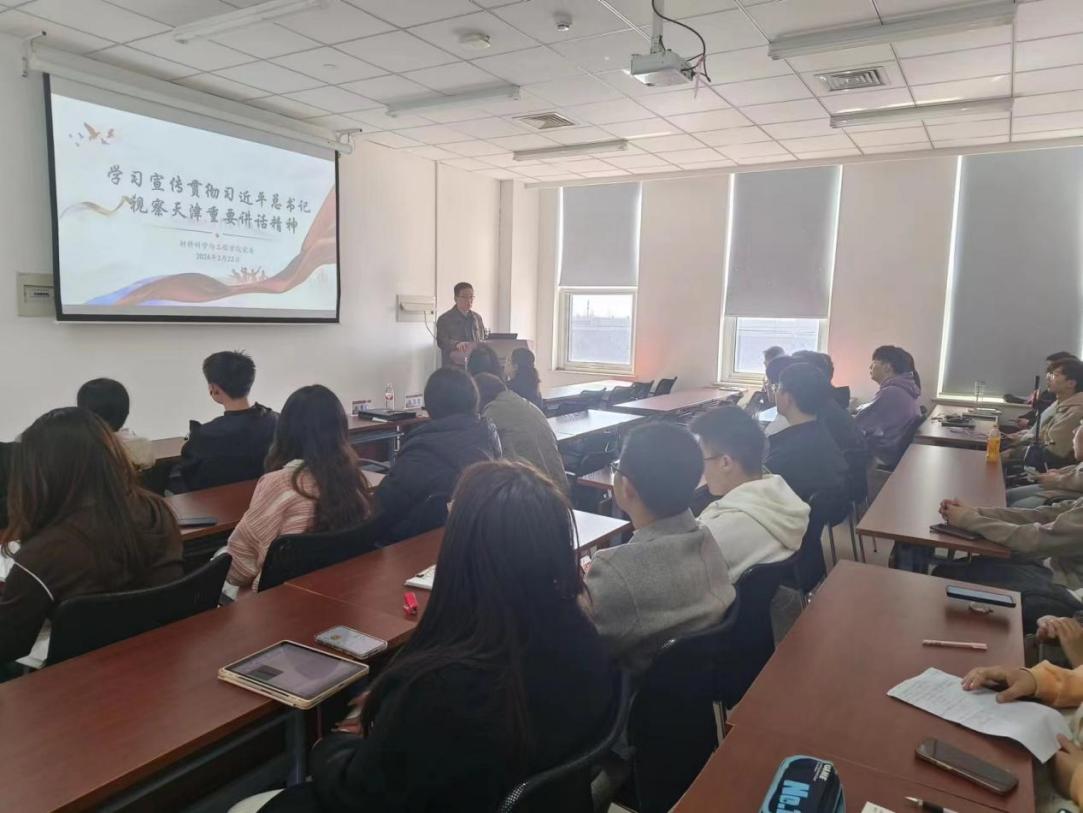 为深入领会学习贯彻习近平总书记视察天津重要讲话精神,全面把握其精髓要义,3月22日下午,学院邀请到材料科学与工程学院党委书记赵庚、马克思主义学院副院长张慧芝、材料科学与工程学院正处级辅导员张雪莹,为我院全体学生开展理论宣讲,部分学生党员代表、学生干部参与线下宣讲,其余学生通过观看线上直播方式听取了宣讲内容。会议由学院党委书记赵庚主持。