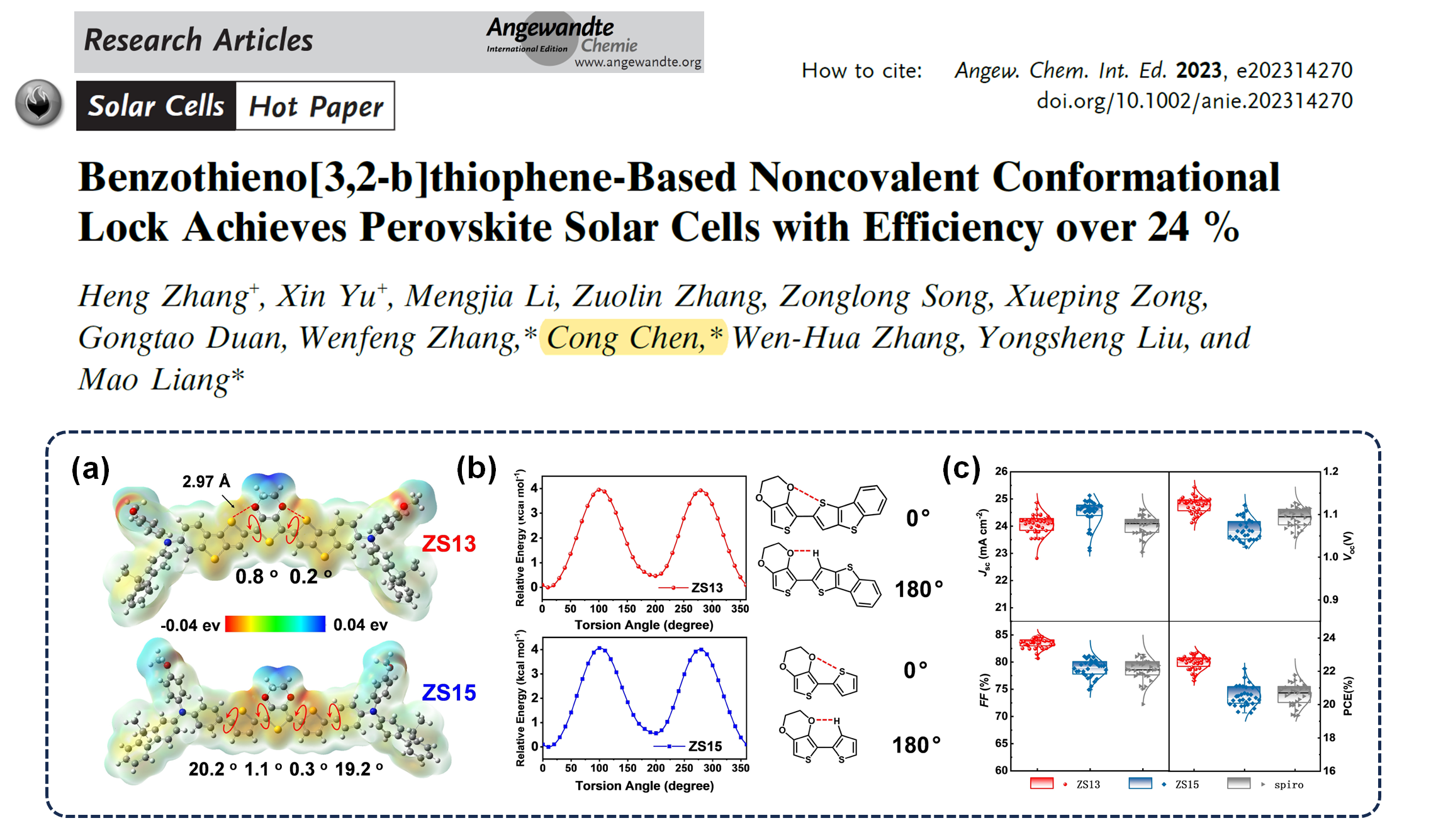 此后,针对电池器件中p型空穴传输材料的弱电荷提取/传输性质,团队成员提出了一种基于苯并噻吩的非共价构象锁的空穴传输分子结构。通过在钙钛矿太阳能电池中的空穴传输材料中引入这种结构,大大提高了器件效率和空穴抽取能力。这一研究的核心创新在于使用BTT构建了新型的有机半导体非共价构象锁,其能够显著改善分子间的电荷提取/传输性质,实现了适当的能级对齐和有效的表面钝化效应。结果,基于该策略的器件分别在0.1和1.01 cm²的孔径面积上实现了24.39%和20.95%的效率。该研究的意义在于通过精准设计的分子结构,不仅提高了空穴传输材料的空穴输运效率,同时还显著提升了电池器件的稳定性。(Angew. Chem. Int. Ed., 2023, 135, e202314270.)
