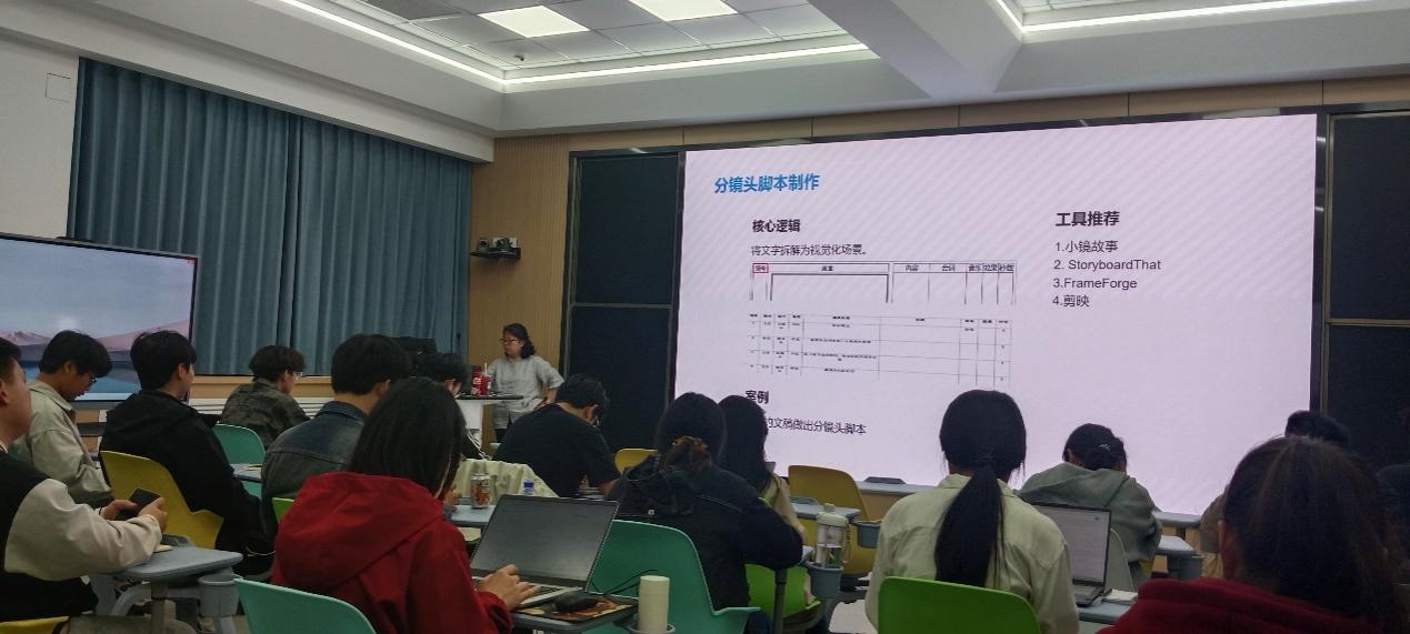 随后,培训围绕视频制作全流程详细展开。在分镜头脚本制作环节,邹老师为大家讲解了将文字转化为可视化场景的技巧,介绍了“小镜故事”等实用的制作工具。关于素材采集部分,邹老师给大家分享了实拍、版权素材及AI生成等多元获取途径。在讲解镜头语言知识时,邹老师结合视频案例清晰地讲述了景别、运动镜头、剪辑节奏以及转场技巧等专业知识,加深了同学们对镜头语言的理解和感悟,同学们积极回应,现场学习氛围十分浓厚。