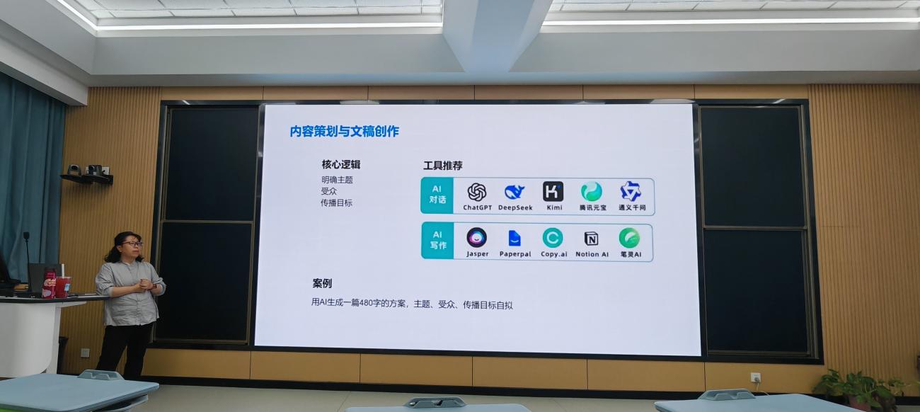培训伊始,邹老师聚焦内容策划与文稿创作,强调创作首先要明确其主题、受众和传播目标。她结合豆包、ChatGPT等AI工具,现场演示生成创意文稿的方法。同学们跟随老师的指导进行实操,当看到AI快速输出逻辑清晰的内容时,惊叹声此起彼伏,直观感受到AI在文字创作中的高效。