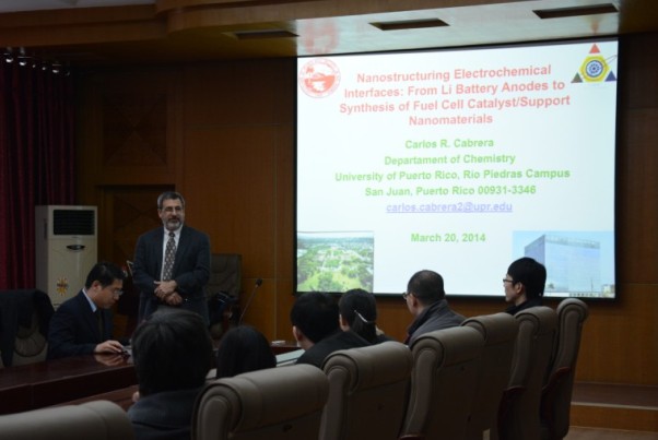 下午2:30,在图书馆报告厅Carlos R. Cabrera教授做了题目为“Nanostructured Electrochemical Interfaces: From Li-ion Battery Anodes to Synthesis of Fuel Cell Catalyst/Support Systems”的讲座,系统讲述了实验体系的搭建过程以及实验成果。陈中方博士就如何写一篇好的科研论文做了报告,我校近100余名师生参与了学术报告,并对两位教授的报告报以热烈掌声。
