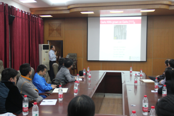 报告介绍了MOCVD生长三五族纳米线以及采用先进透射电子显微分析技术对纳米线生长机理以及结构-性能关联的详细分析。通过邹进教授的报告使师生们了解高分辨透射电镜、EDS能谱分析、SAED选区电子衍射对纳米线生长机理的分析方法。邹教授的精彩报告引起了在座师生的浓厚兴趣,大家积极提问,邹教授也对这些问题进行了认真且详细的回答。