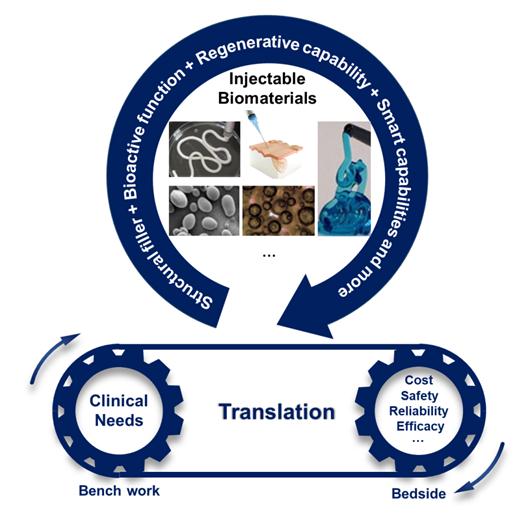 图:可注射材料的研究和转化需从临床具体需求出发,逐步引入缺损填充、生物活性、组织再生、智能材料等设计理念,并充分考虑成本、安全性、可靠性、治疗效果等具体要素。