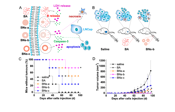 通过调节处理温度来合成不同结晶度的中空氮化硼纳米球作为B元素的储存库来诱导B的释放。体外实验表明具有中等结晶度和B释放速度的中空BN球能减少前列腺癌细胞的生存以及增强细胞凋亡能力。皮下肿瘤小鼠模型进行体内实验证明BN中空球能明显抑制肿瘤的生长,使用原位肿瘤生长模型同样验证了BN球的体内抗癌效果。除此之外,将空心BN球与紫杉醇同时使用,也出现了抑制肿瘤生长的协同效应。这些工作表明氮化硼中空球在前列腺癌肿治疗药物领域具有重要的应用前景和价值。该成果发表在Nat. Commun. 上,DOI:10.1038/ncomms13936。