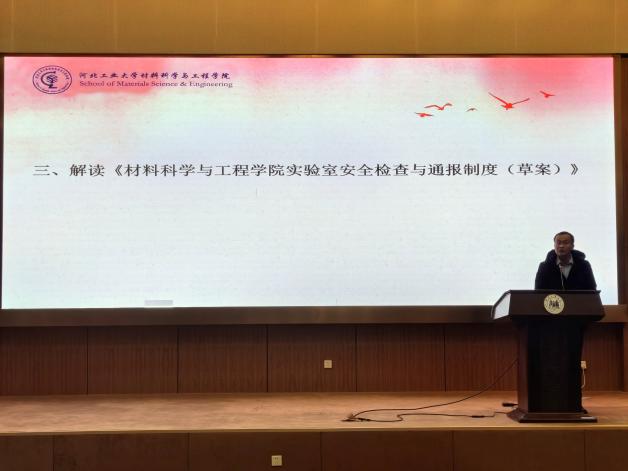 会议第三项议题,由夏兴川对《材料科学与工程学院实验室安全检查与通报制度(草案)》进行解读,并对学院存在的安全问题进行通报,同时对实验室安全工作提出要求,提醒教师筑牢安全红线。