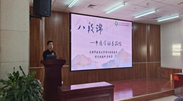 接下来由宗振勇讲解及示范八段锦-中医学的易筋经,在宗振勇的带领下,教工们现场学习八段锦的动作与要领。作为中华医学的健身功法,八段锦巧妙地将机体的形体运动和呼吸模式进行了结合,具有拉伸筋骨、疏通经络、防病治病等多种功效。在场的教职工们表示八段锦简单易学,做完一整套动作之后全身放松、神清气爽。