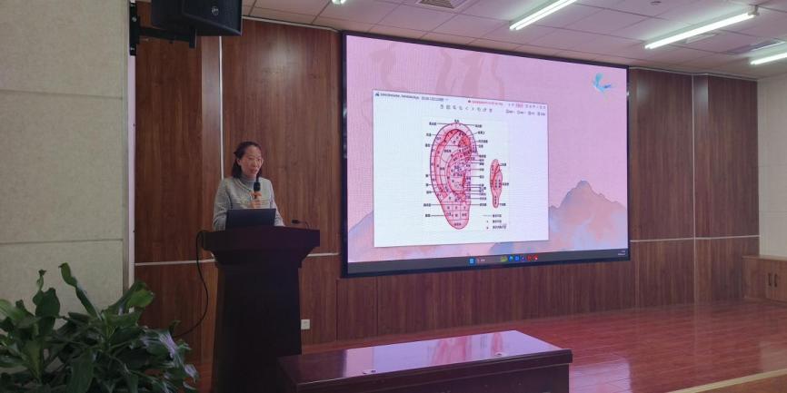 随后纪雪梅为在场的教职工讲解了针灸、耳穴贴敷。纪雪梅解释了耳部穴位与身体各个器官之间的关系,以及按摩这些穴位可以促进气血流通、调节内分泌系统、缓解压力等方面的作用,并详细介绍了耳部穴位的具体位置和按摩方法,指导教工们如何正确地寻找和按摩耳廓上的不同穴位,同时强调了按摩的力度和频率的重要性。