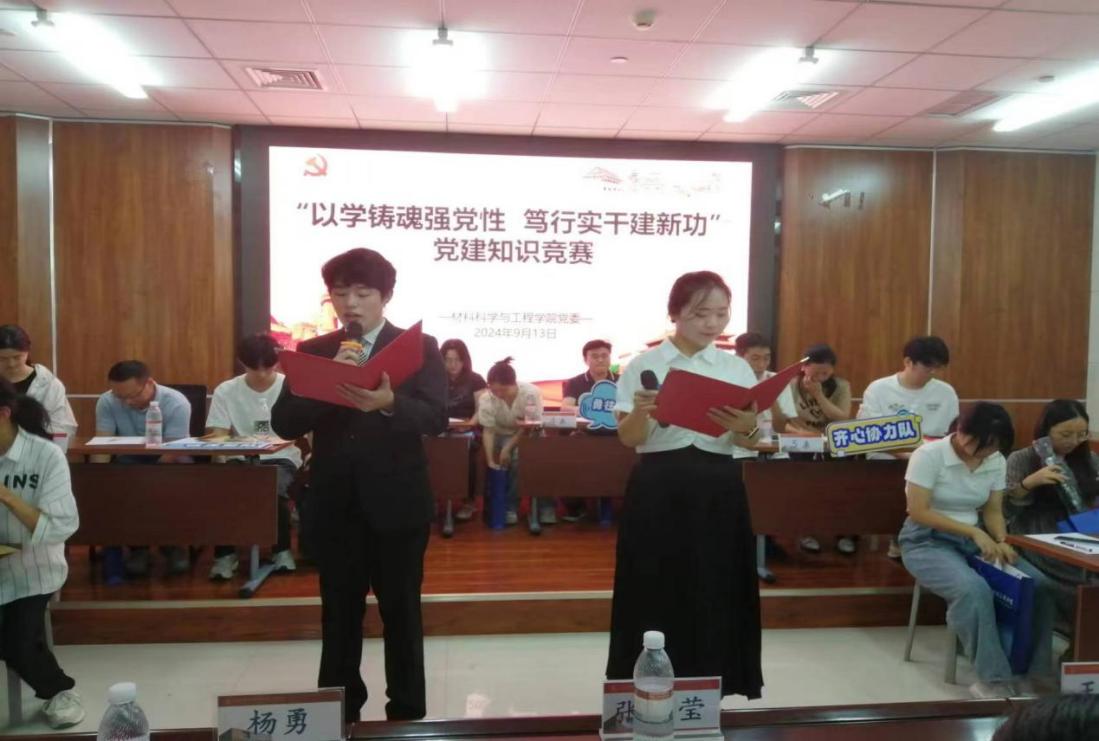 9月13日下午14:00,材料科学与工程学院“以学铸魂强党性,笃行实干建新功”党建知识竞赛线下推荐赛于机材楼C514举行。学院正处级辅导员张雪莹、党委副书记兼副院长王建昆、副院长杨作为嘉宾出席活动,各党支部代表、积极分子、参赛选手亲友团80余人观摩。